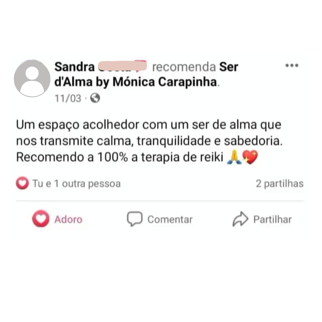 "Recomendo, a Mónica é uma excelente terapeuta de Reiki e a forma como é dedicada e pratica Reiki nas sessões, tem feito toda a diferença, no aspecto físico, mental e emocional assim como espiritual"
